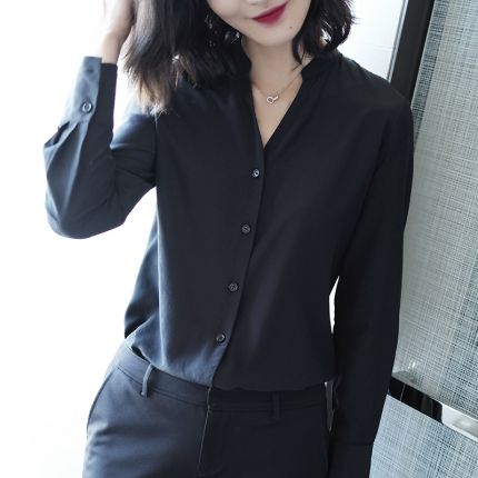 吸睛丝垂雪纺v领黑色衬衫女设计感小众长袖衬衣女2020新款上衣女