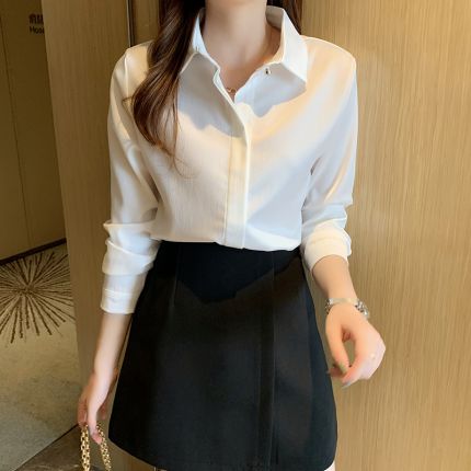 2020秋装新款长袖上衣缎面白色加绒衬衫女设计感小众雪纺职业衬衣